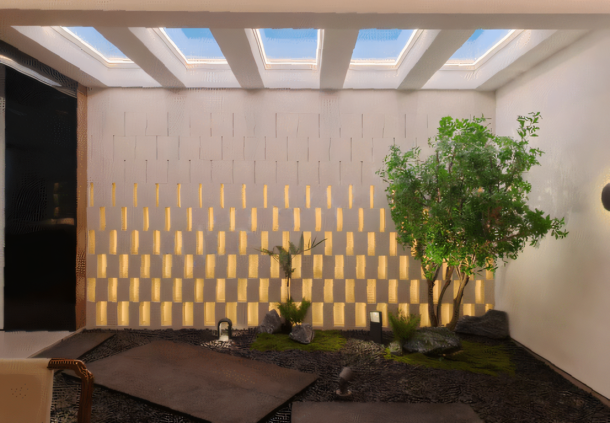 Efek visual menciptakan sensasi keterbukaan dan cahaya alami, secara dramatis meningkatkan kenyamanan tamu.
